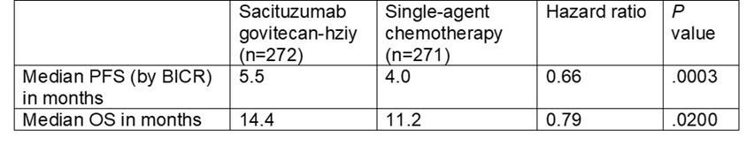 The approval was based on results from the TROPiCS-02 trial, a randomized, active-controlled, open-label trial of 543 patients who received either sacituzumab or single-agent chemotherapy with eribulin, capecitabine, gemcitabine, or vinorelbine. Sacituzumab use lead to a significant 34% reduction in risk of disease progression or death (Table 1). At 1 year, the PFS rate was 21% in the sacituzumab govitecan arm vs 7% in the chemotherapy arm. In addition, overal survival (OS) in the sacituzumab arm was significantly longer, translating to a 21% reduction in the risk of death.